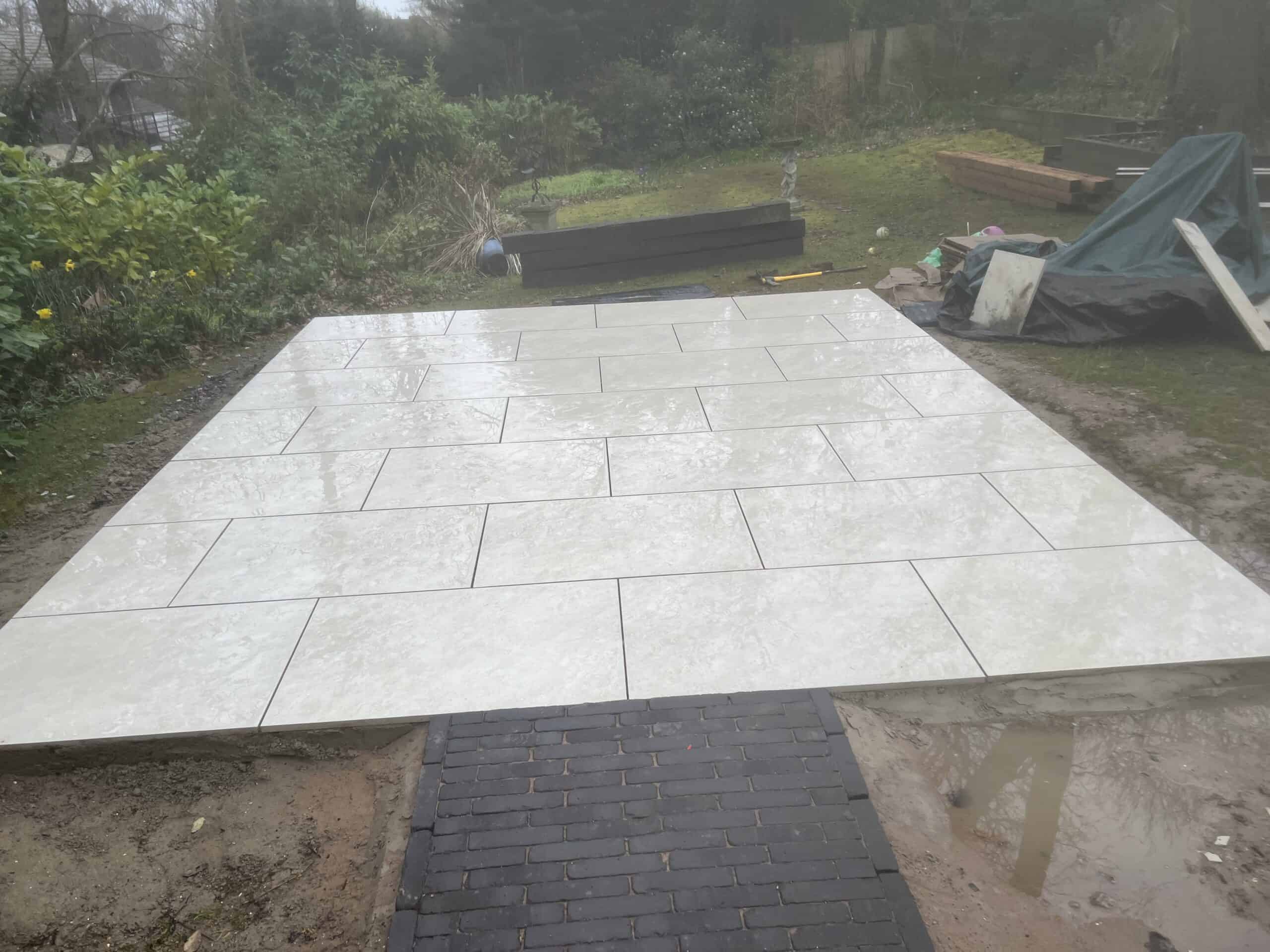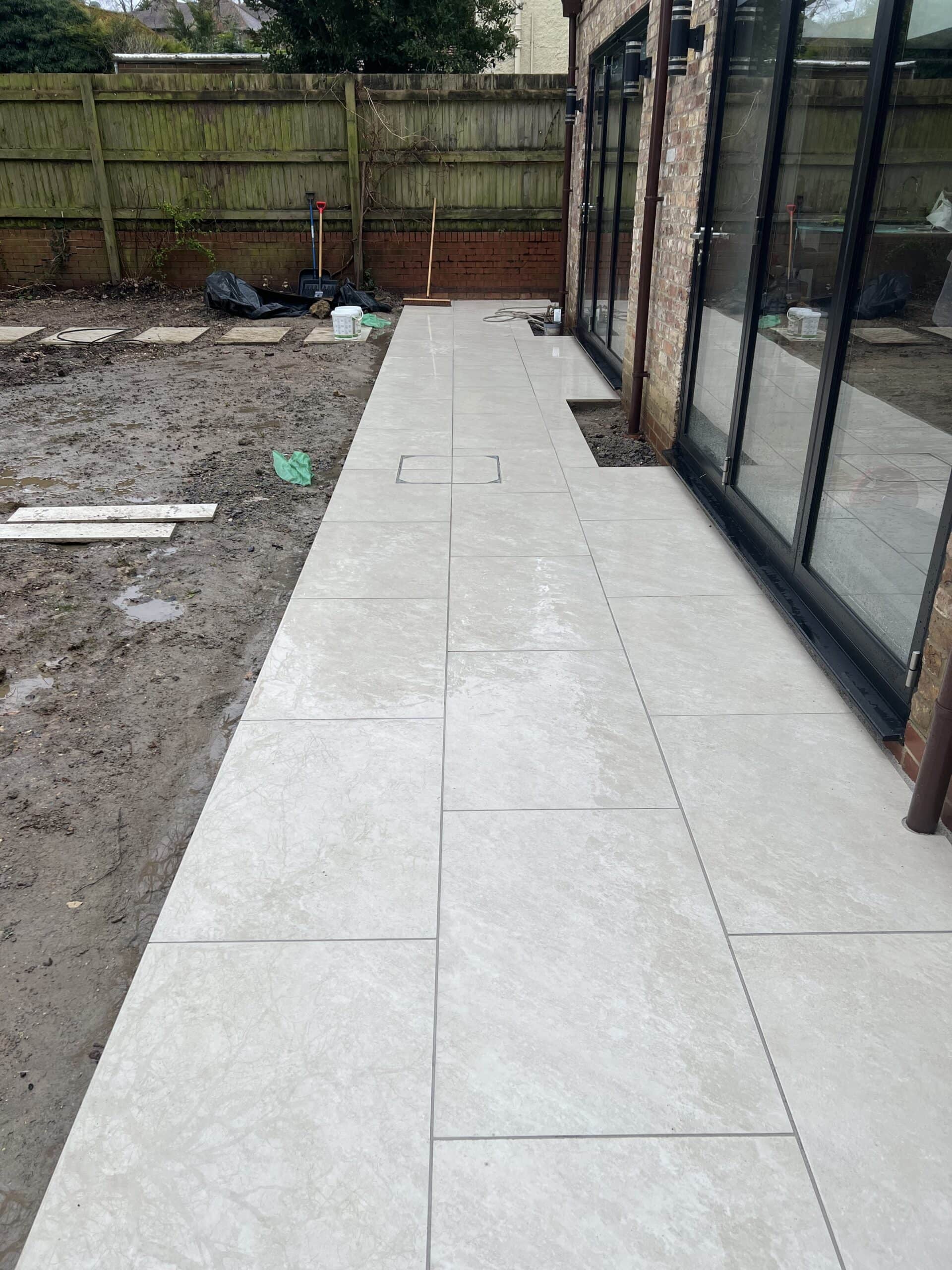 Newly installed porcelain patio in Wrecclesham, showcasing durable and stylish outdoor flooring.