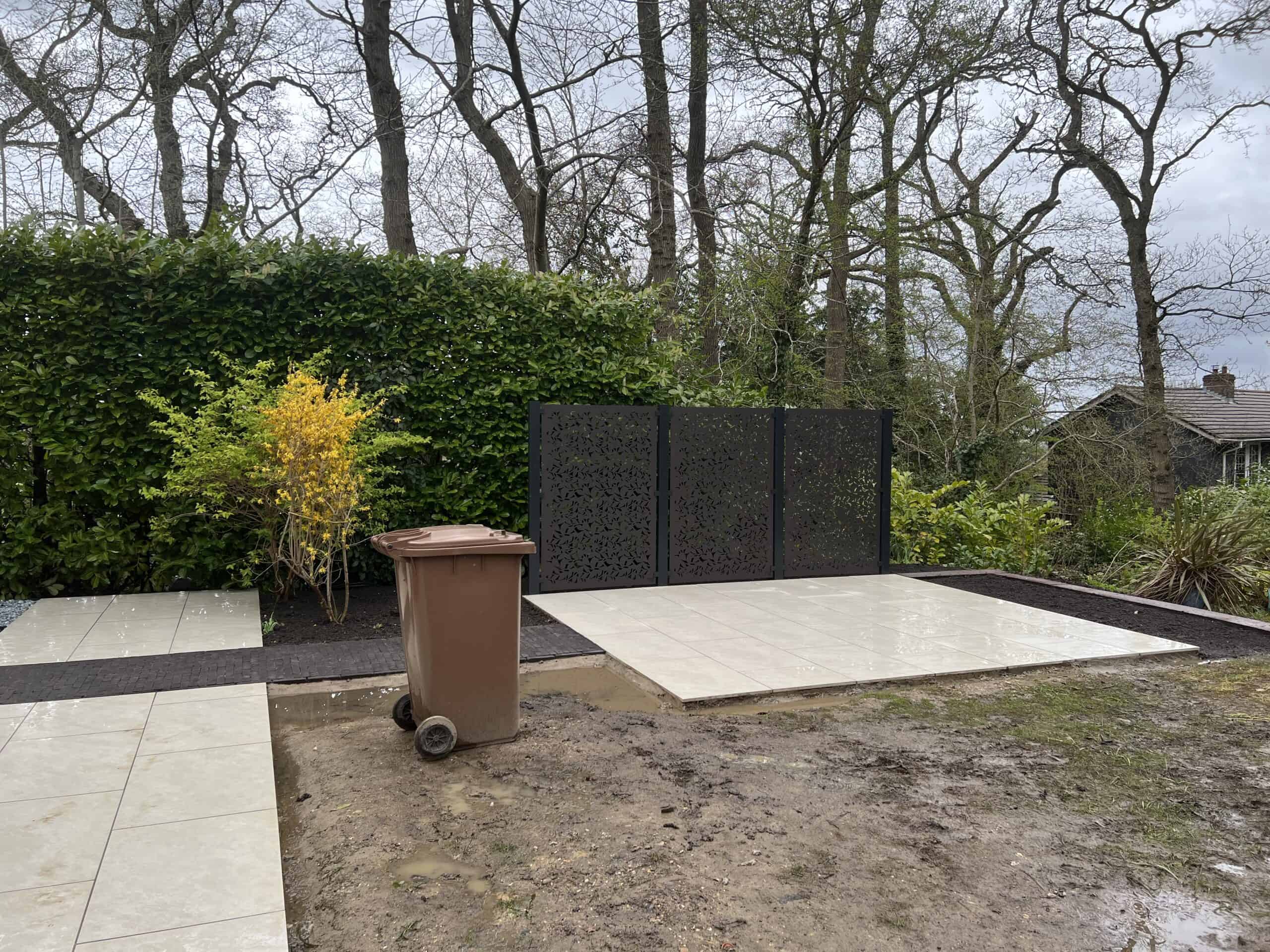 A sleek porcelain patio with a decorative privacy screen, perfect for outdoor living in Wrecclesham. Expertly installed by ConstrucTek.