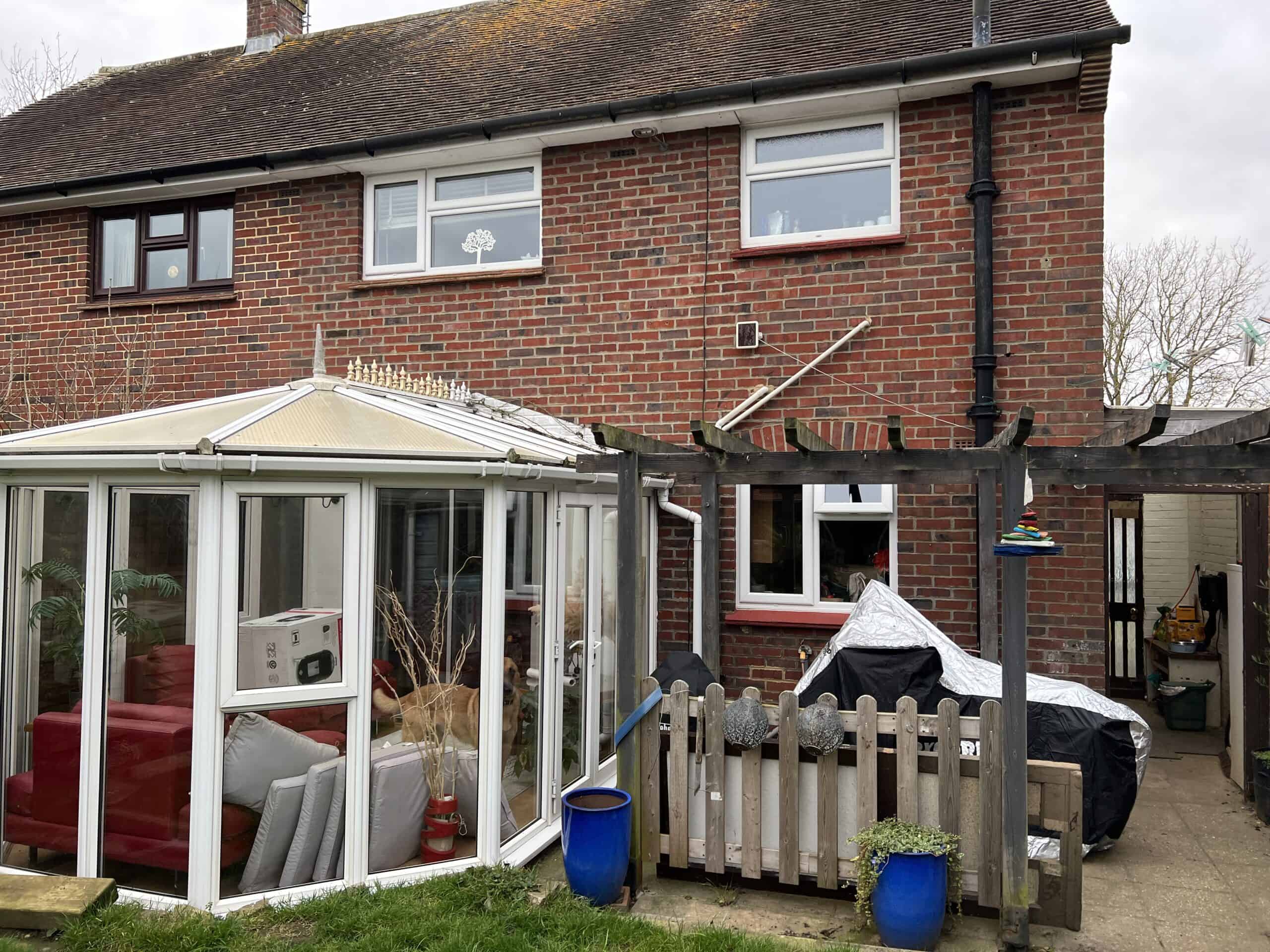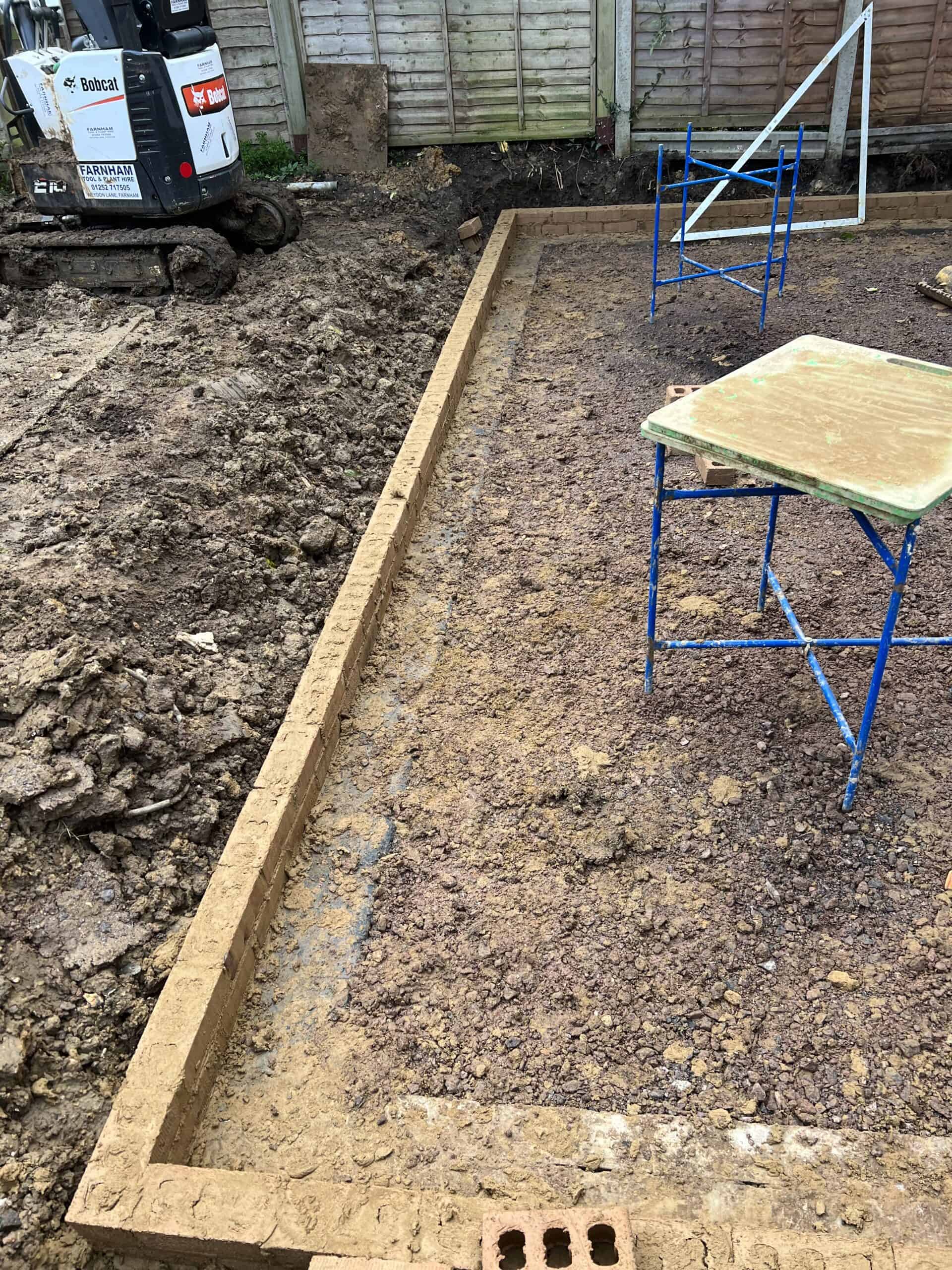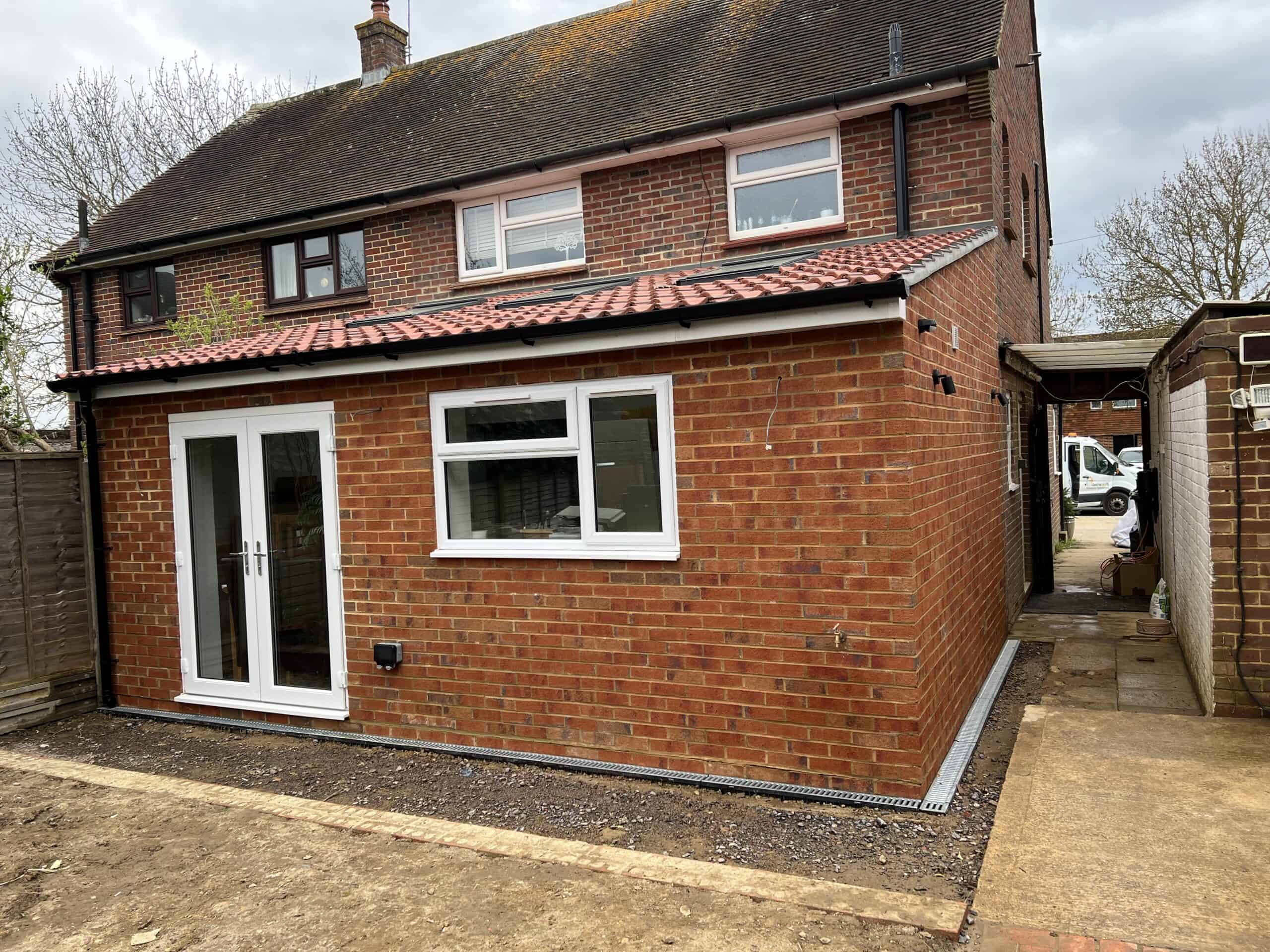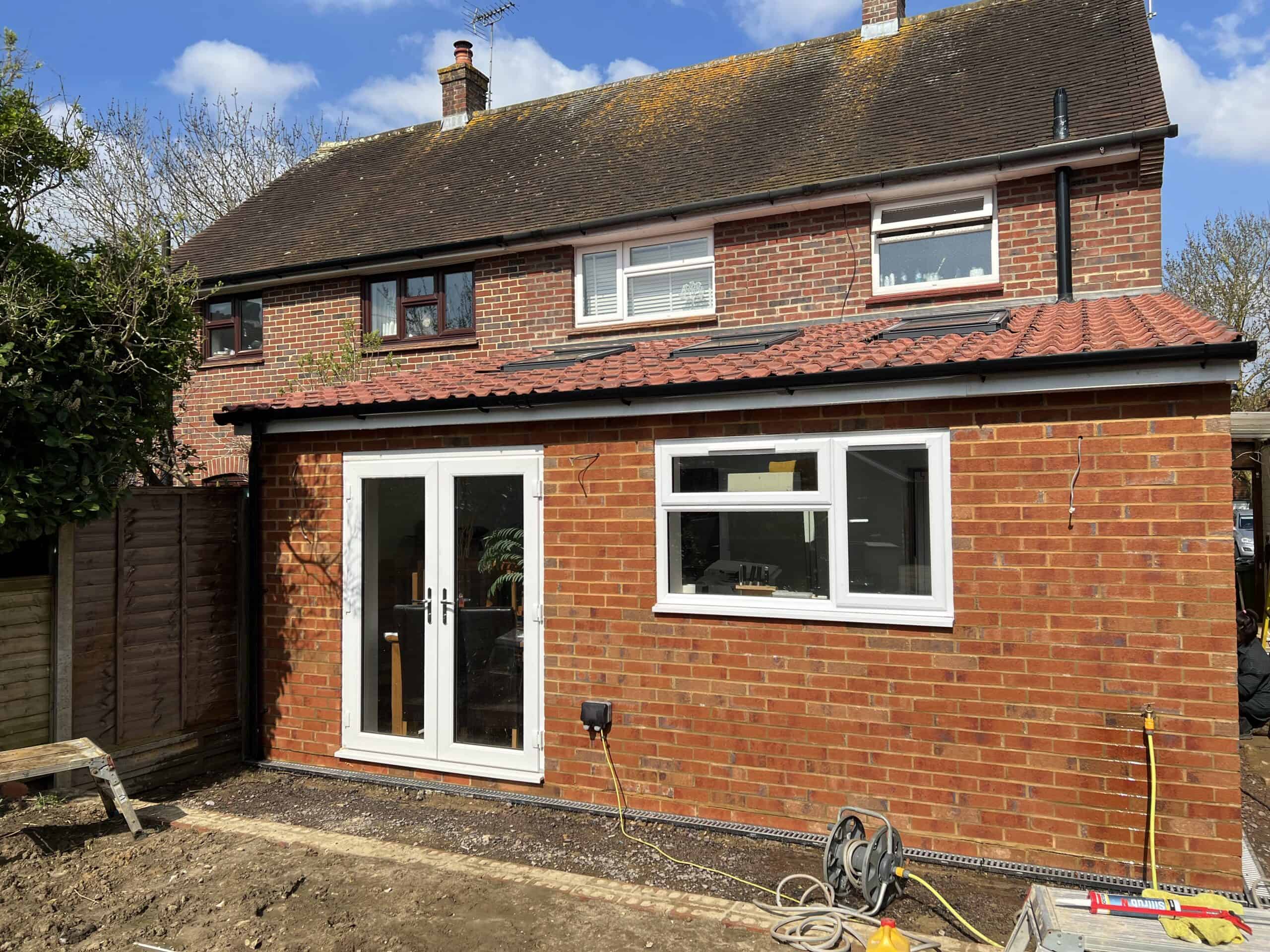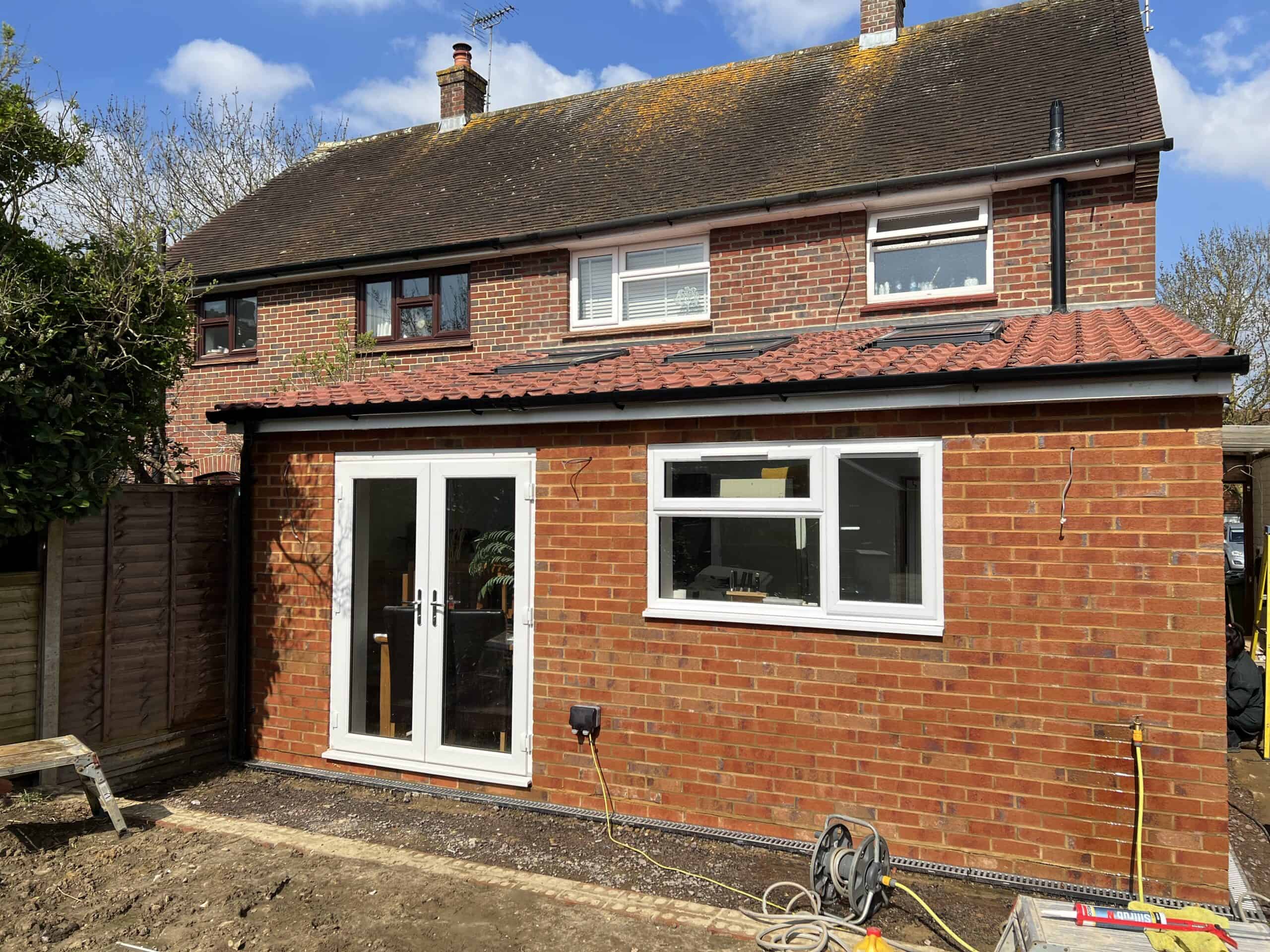 Construction of a single-storey rear extension with brickwork in Tongham, showcasing quality craftsmanship and building expertise.