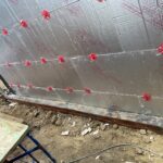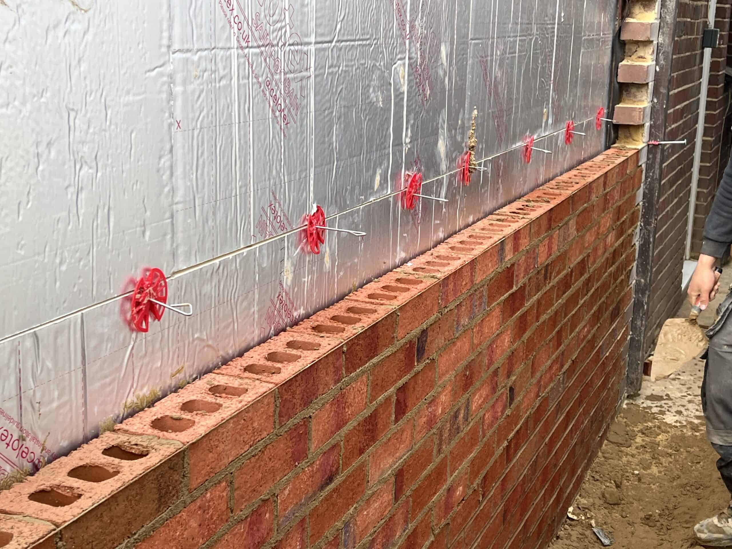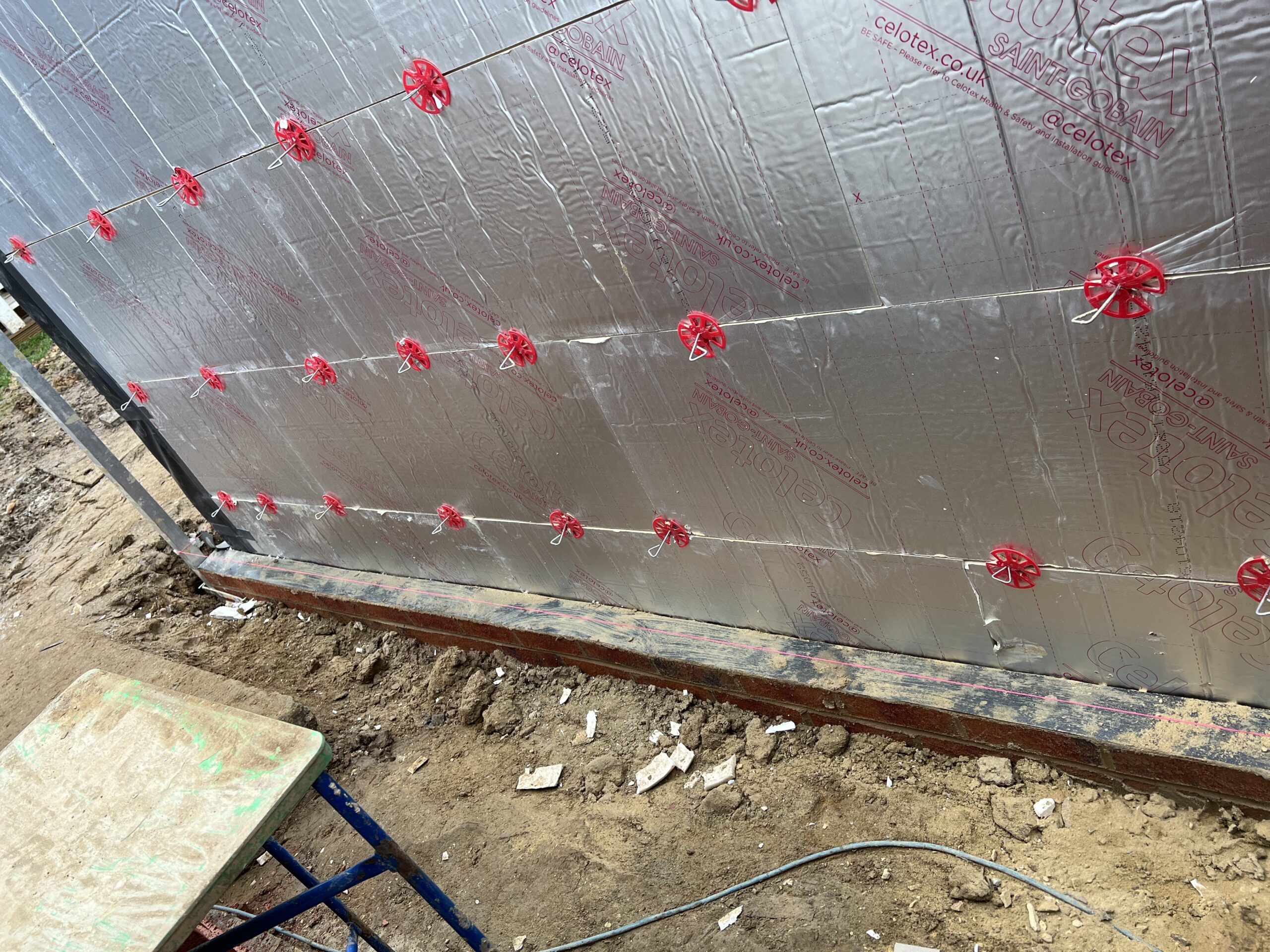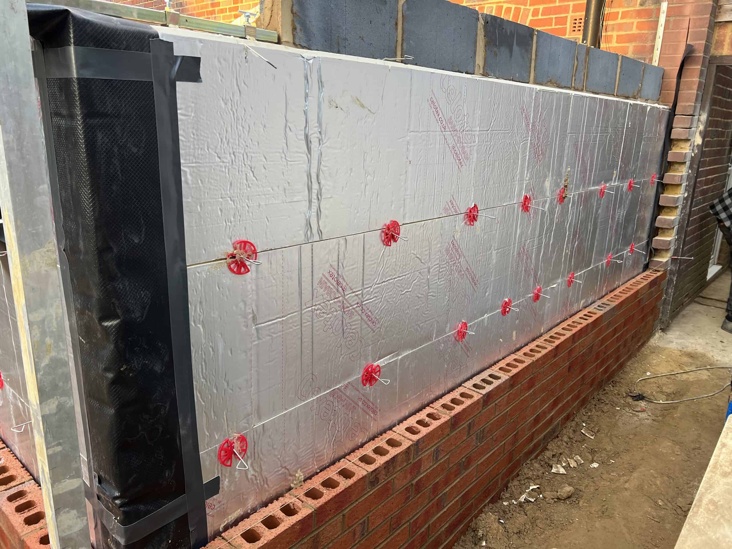 Construction site showing insulation panels being fitted to the rear wall of a house.