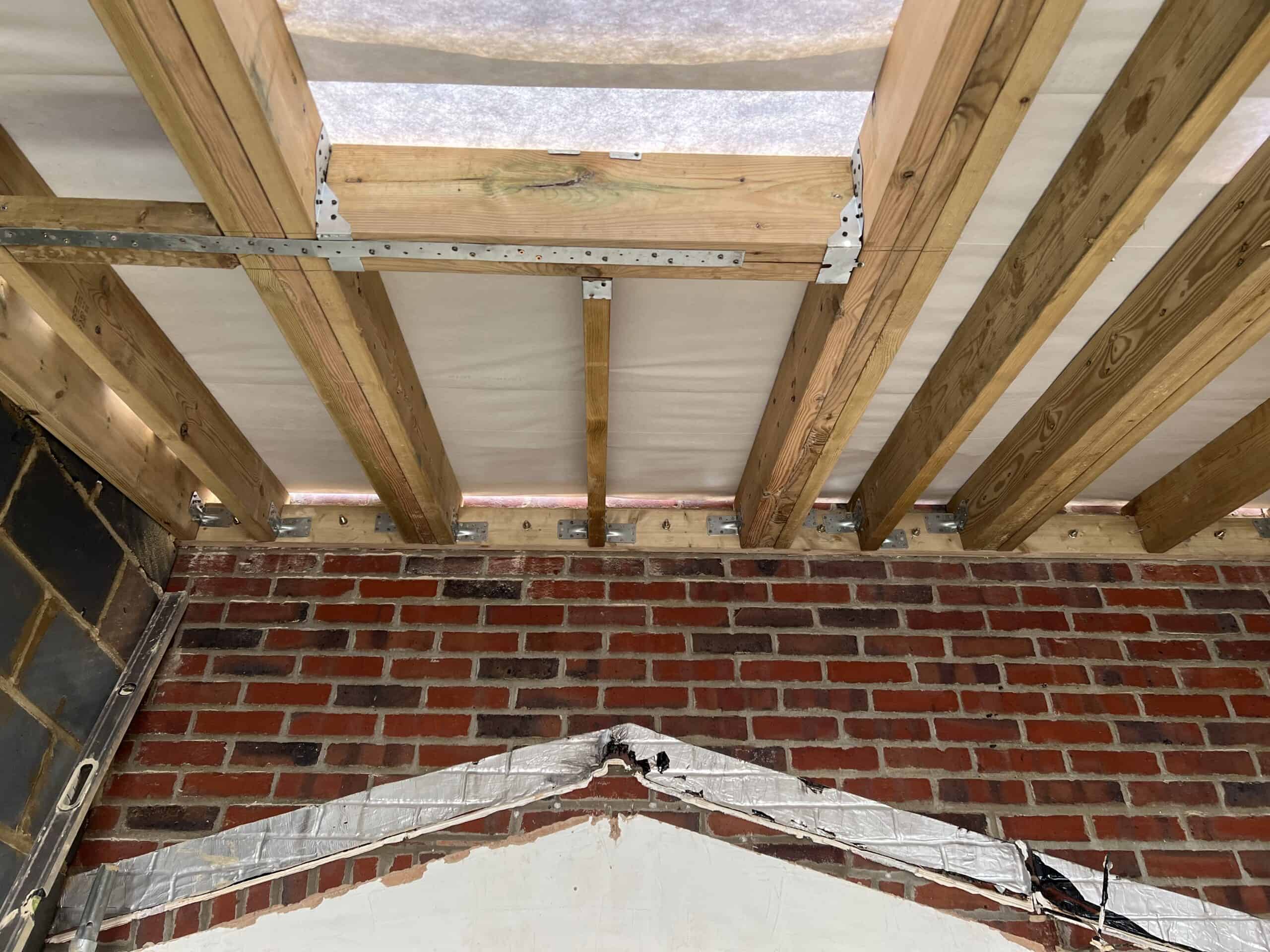 Construction of a single storey rear extension showing roof structure and brick wall.